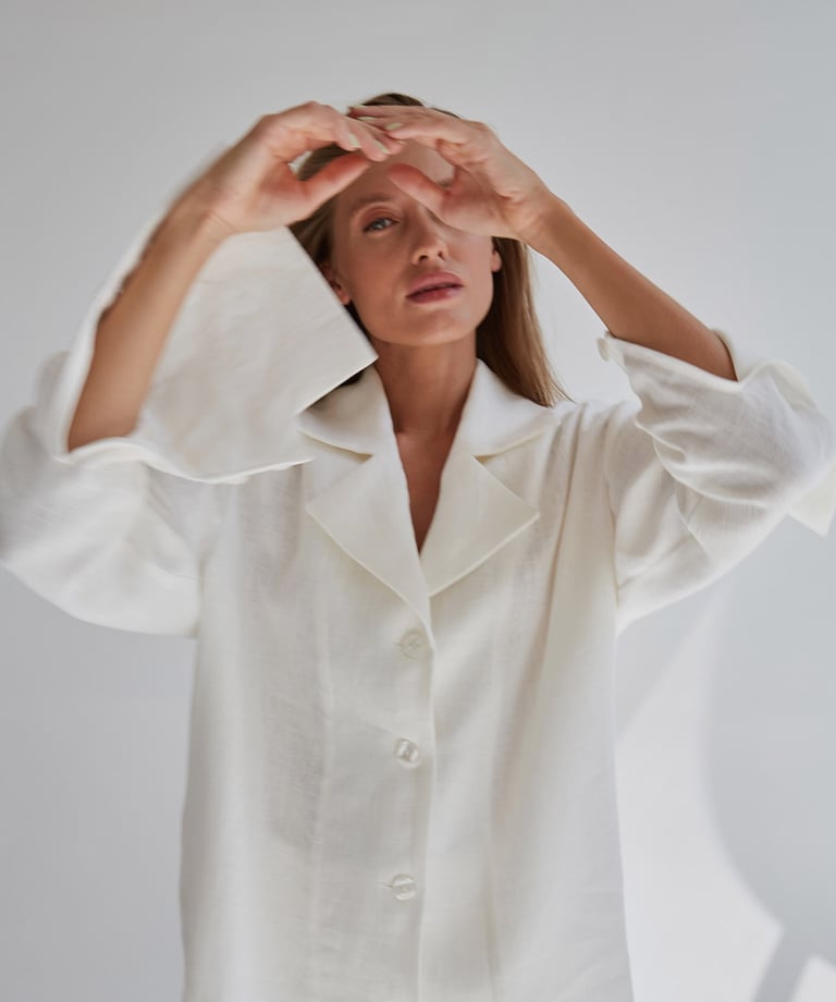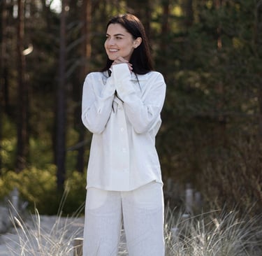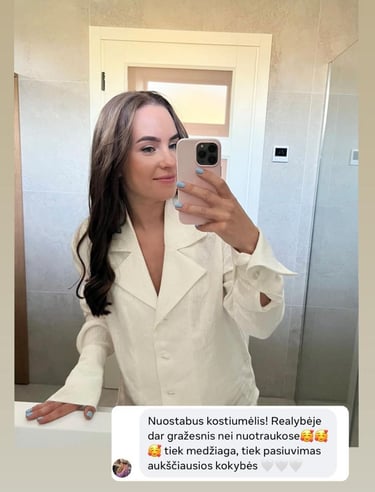 Po ilgų ieškojimų kokybiško lino, pasirinkome būtent šį - itin aukštos kokybės liną, kuris yra standesnis ir atsparus aplinkos poveikiui. Rūbai siuvami individualiai, ne masinėje gamyboje, todėl kiekvienas drabužis yra siuvamas su preciziškumu ir kruopščiai apžiūrimas prieš perduodant pirkėjoms.